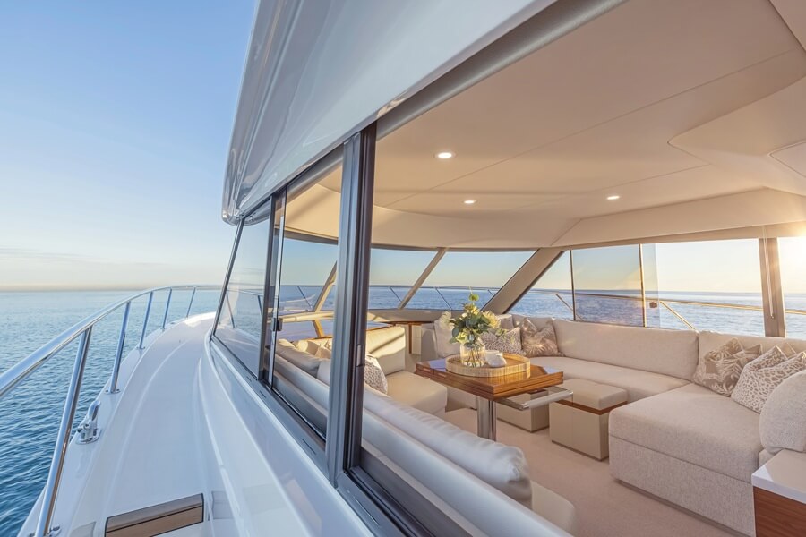 The cockpit is decked out with a eating desk and seating, which each invert to disclose the massive lazarette under, lockers on all sides, Fusion speaker and Garmin Marine IP digicam, in addition to roll-down clears for added safety and privateness. The aft deck is considerably of a clean slate on which homeowners can write their very own preferences: additional built-in seating or storage abutting the sliding doorways, TV and leisure system.