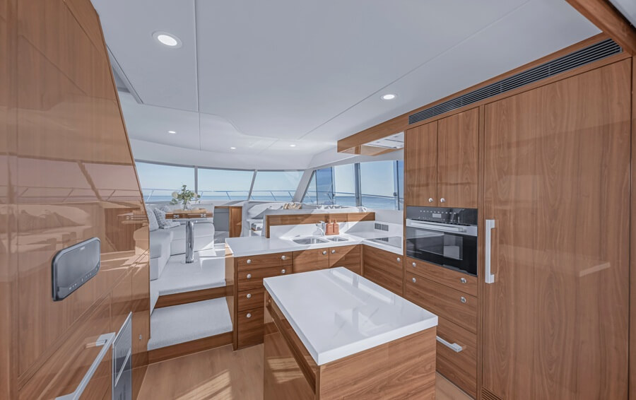 The inside of the M50 units a brand new normal for 50ft yachts. In measurement and accoutrements, fitted with Miele home equipment, stone benchtops, and gloss walnut cabinetry, the galley rivals that of the M55.
