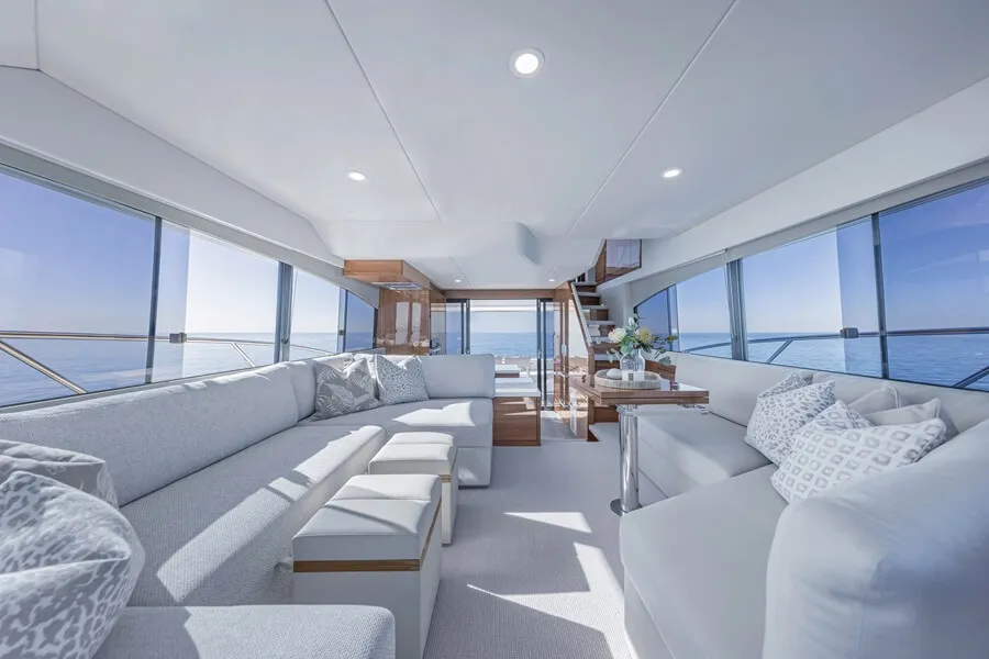 The inner reverse staircase, with enclosed risers for security – a characteristic Maritimo has perfected over the previous 20 years – leads from the saloon to the enclosed flybridge.