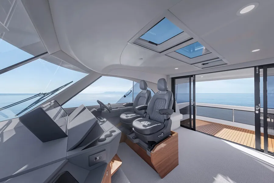 The geometric reverse rake windscreen cuts down the glare and facilitates run-off from rain or sea spray. Adjustable twin helm seats provide heating for the skipper and co-pilot’s consolation, and a big skylight opens the flybridge to the sky above.